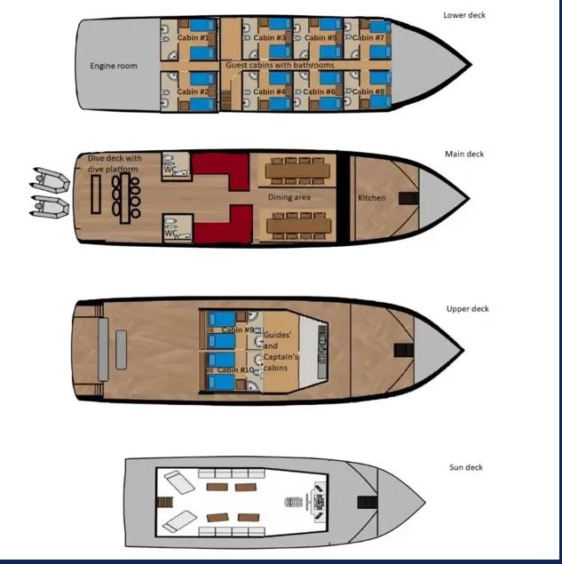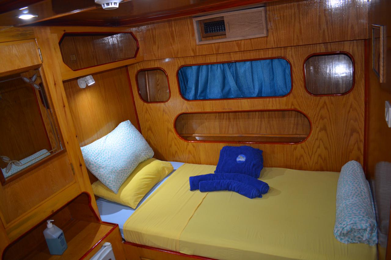 10 cabine per rilassarvi nel comfort dopo una giornata in mare. Le cabine sono accoglienti, climatizzate e dotate di bagno privato, offrendo tutto il necessario per un soggiorno riposante. Lenzuola fresche e servizio di pulizia giornaliero garantiscono il massimo comfort durante tutto il viaggio. Tutte le cabine sono dotate di aria condizionata individuale.