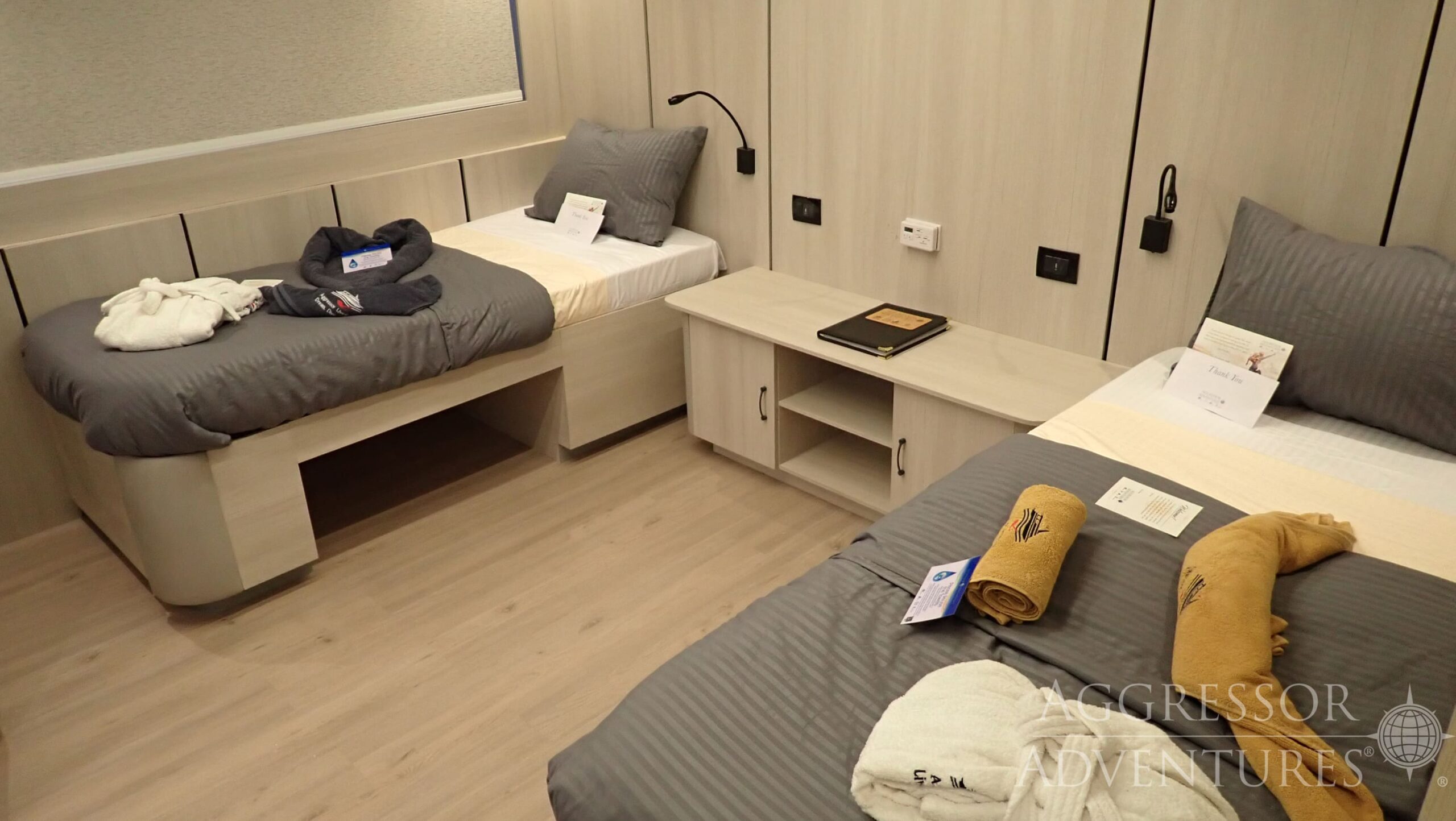 Il Red Sea Aggressor V dispone di 4 cabine Master con letto matrimoniale e oblò e 9 cabine Deluxe con letti doppi o twin.