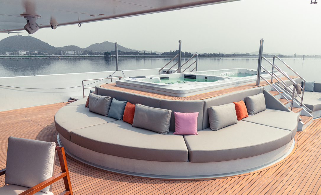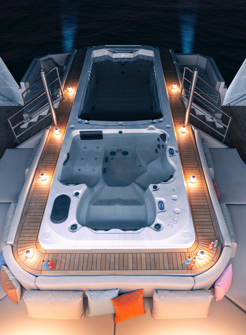 Posti a sedere all'aperto sul ponte principale e vasca idromassaggio da 6 metri
