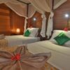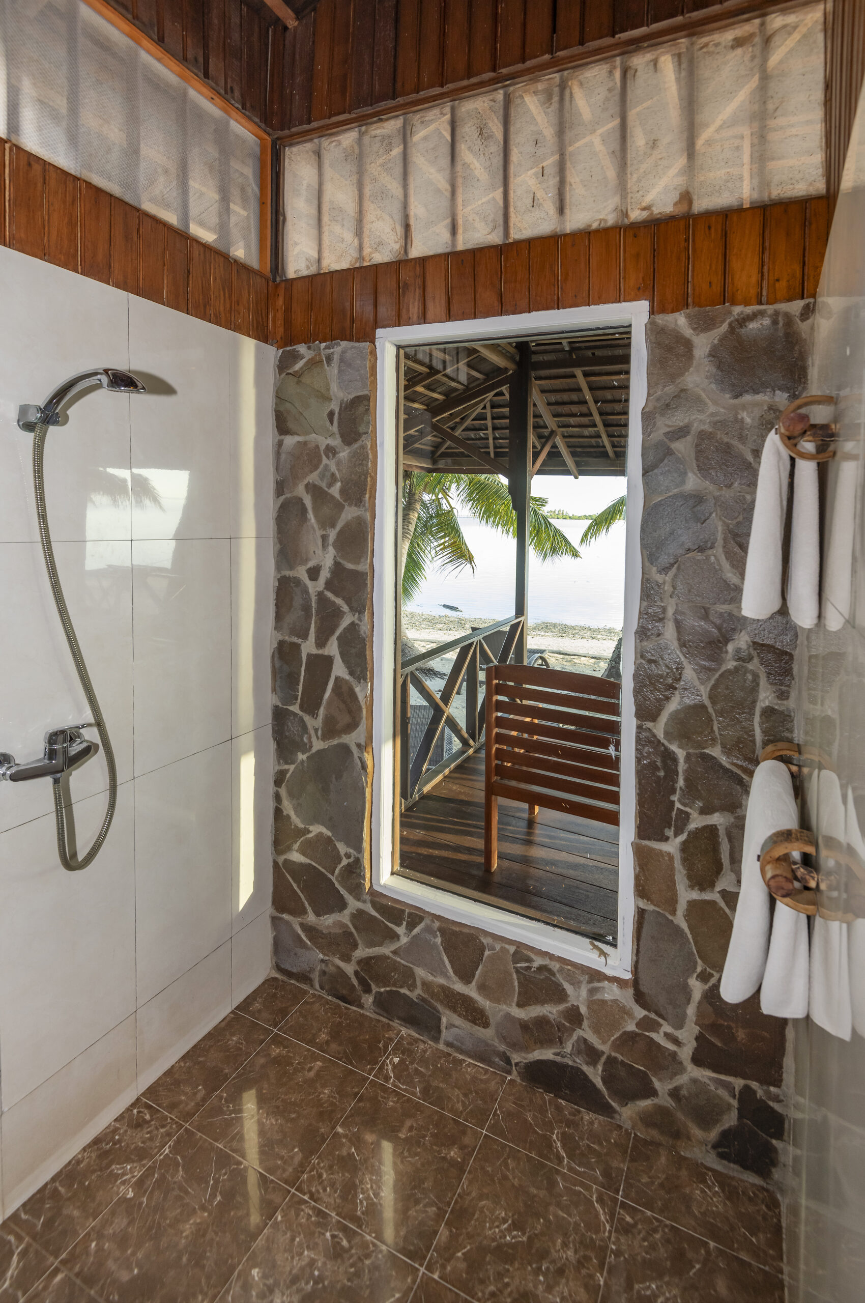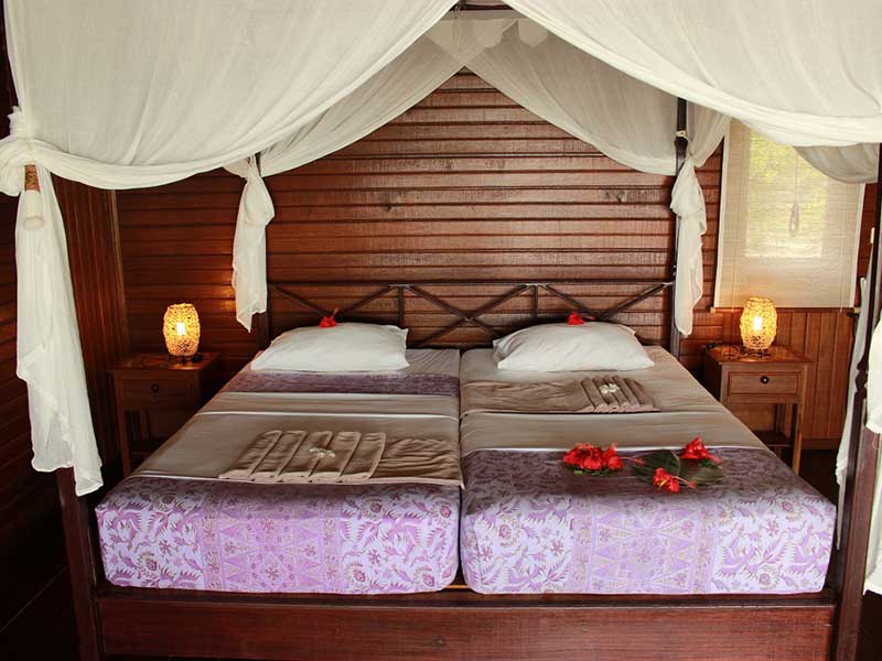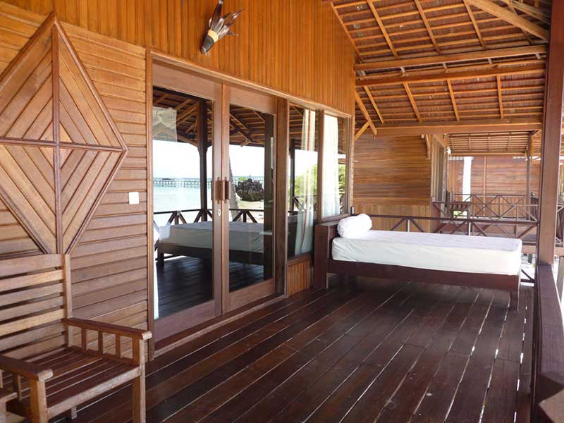 12 notti in bungalow fronte spiaggia al Nunukan Island Resort con aria condizionata, cassaforte, minibar, zanzariera, ampia terrazza e bagno con doccia vista panoramica della laguna.